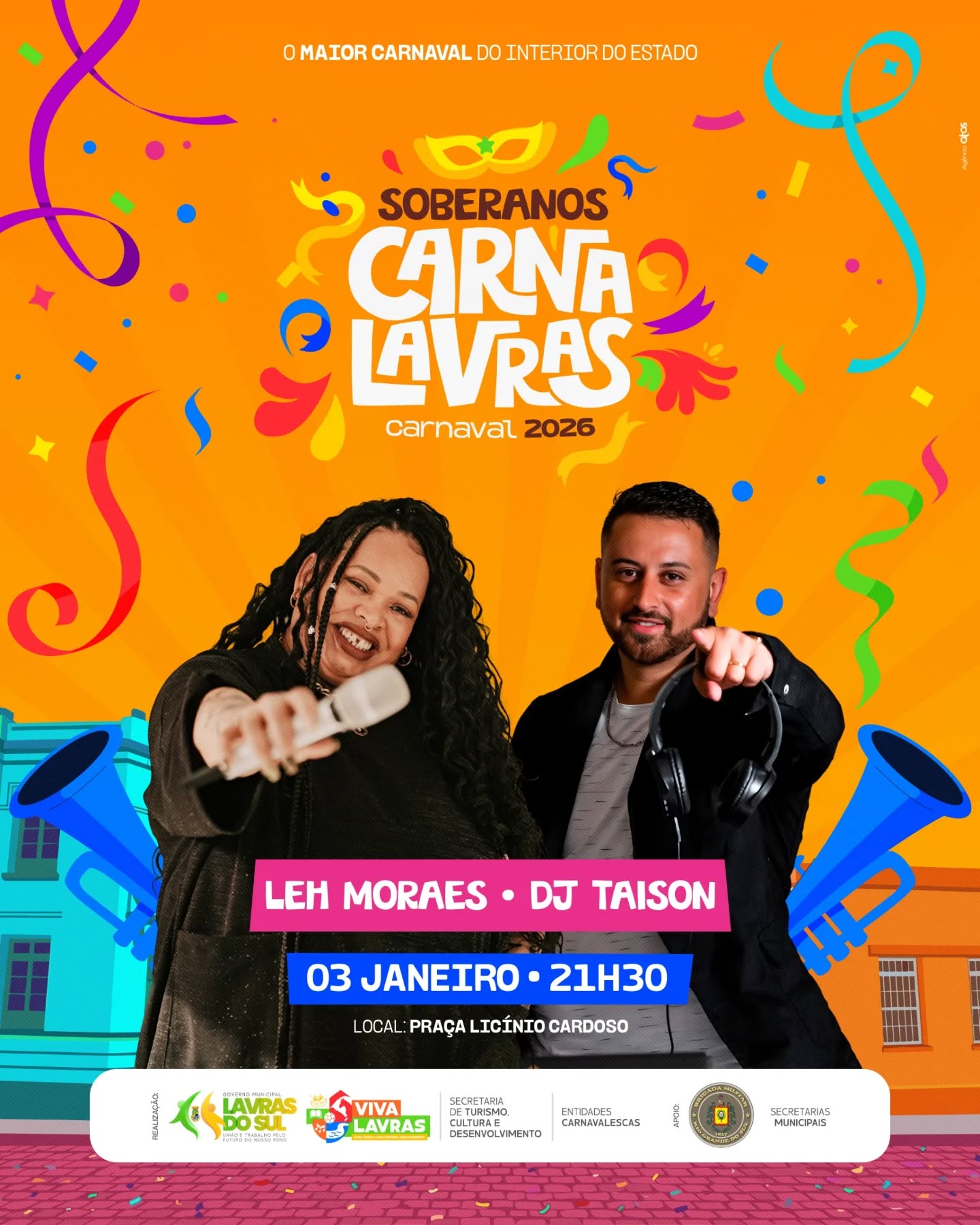 Escolha da Corte dos Soberanos do Carnalavras 2026. Próximo sábado, dia 03 de janeiro, na Praça Licínio Cardoso, a partir de 21h30min, com a participação de nove blocos concorrendo nas categorias Rainha e Rei, nas modalidades Infantil e Adulto. Após, show de Leh Moraes e DJ Taison. Entrada franca.